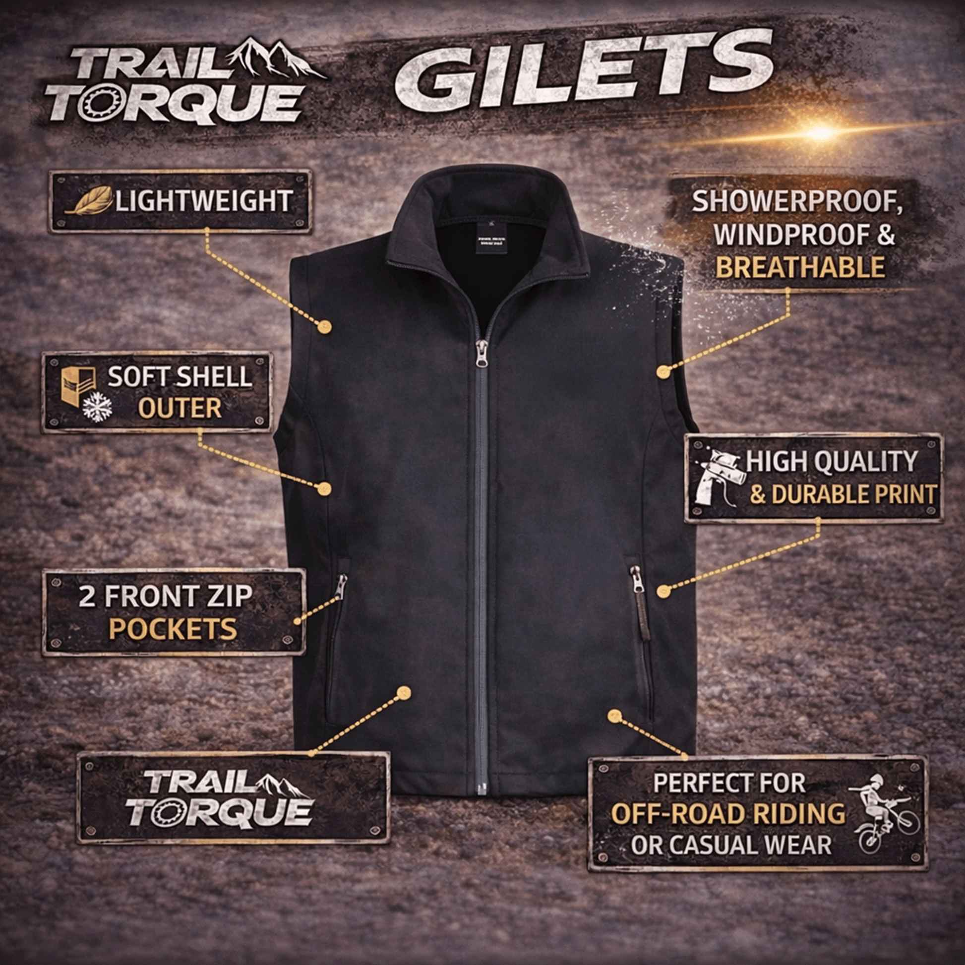 Our #1 best-seller - Our gilets are the essential layer for riders during all seasons. Built from lightweight, durable softshell fabric, our gilets are engineered to block the wind and keep the chill at bay during cold motos, long enduro trails, or early morning track prep. Beyond the dirt, its rugged construction and professional finish make it the perfect custom workwear for teams, mechanics, shops and even for casual wear.